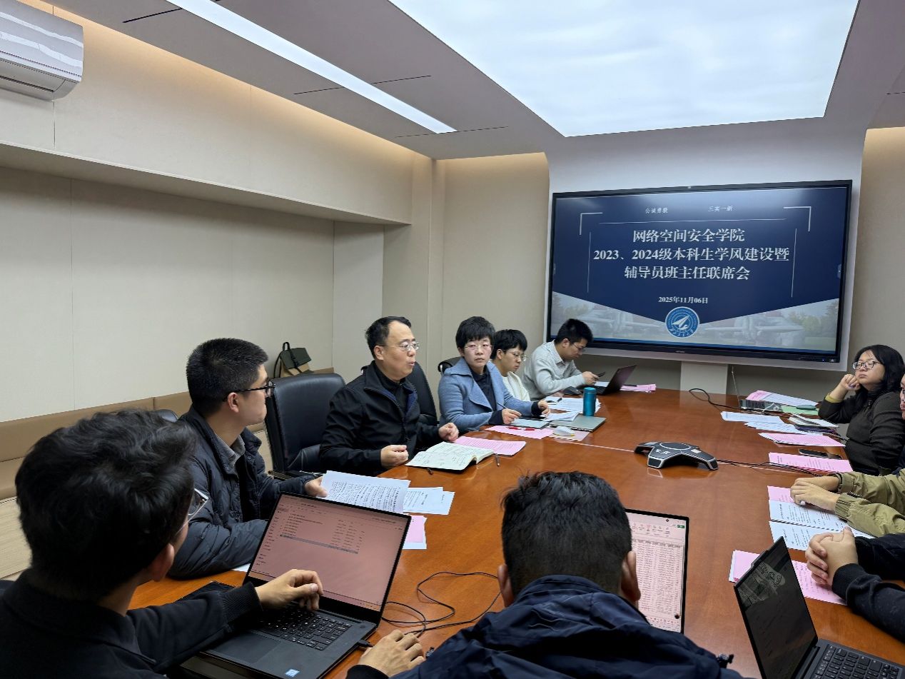 为进一步筑牢本科生学业根基,强化学风建设实效,营造互帮互助、争先创优的学习氛围,网络空间安全学院于11月6日在友谊校区爱生楼401会议室召开2023、2024级本科生学风建设暨辅导员班主任联席会。学院党委书记张文涛、副书记杜瑶、学工主管方雪、大二和大三本科生专兼职辅导员、班主任及学生代表线上线下共同参会,会议由杜瑶主持。