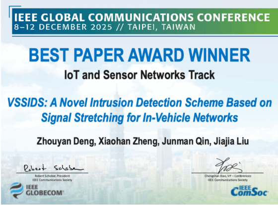 2025年12月8日至12日,全球通信会议(IEEE GLOBECOM 2025)在中国台北举行。会上,西工大网络空间安全学院2023级博士邓舟彦、2024级硕士郑小涵、2022级博士秦郡蔓和刘家佳教授合作完成的论文《VSSIDS:一种基于信号伸缩的新型车内网络入侵检测方案》(VSSIDS: A Novel Intrusion Detection Scheme Based on Signal Stretching for In-Vehicle Networks)获大会“物联网和传感器网络”领域唯一最佳论文奖(Best Paper Award)。