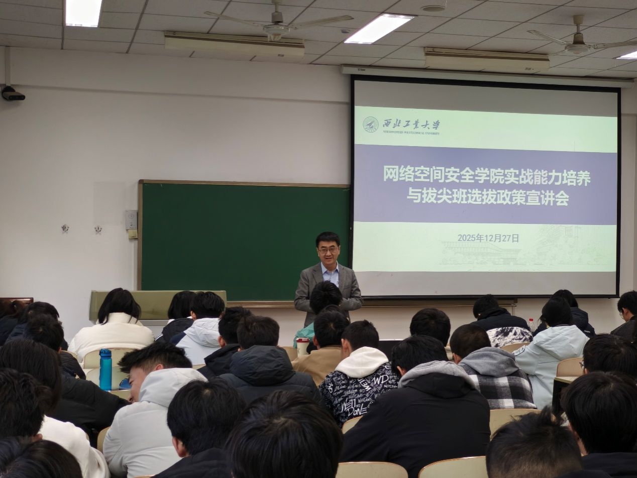 2025年12月27日,网络空间安全学院面向全体大一学生举办实战能力培养与拔尖班选拔政策宣讲会。学院副院长刘志强出席会议并作系统介绍,现场反响热烈。
