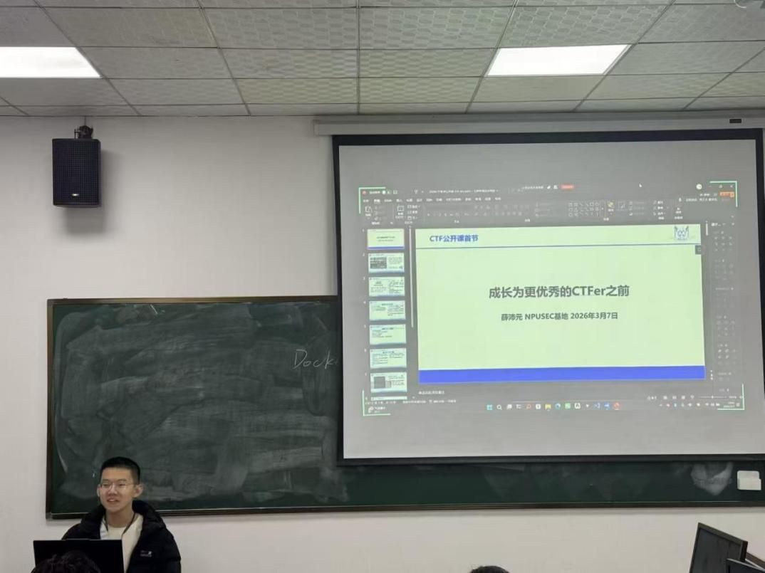 3月7日晚7:30,首节CTF教学公开课在网络空间安全学院104教室顺利举行,周子博担任主讲。来自西工大及其他高校的百余名同学跨校同屏学习、同步提升。