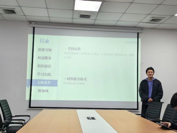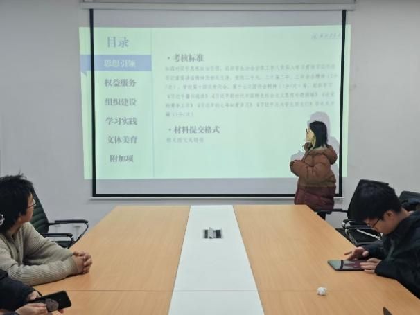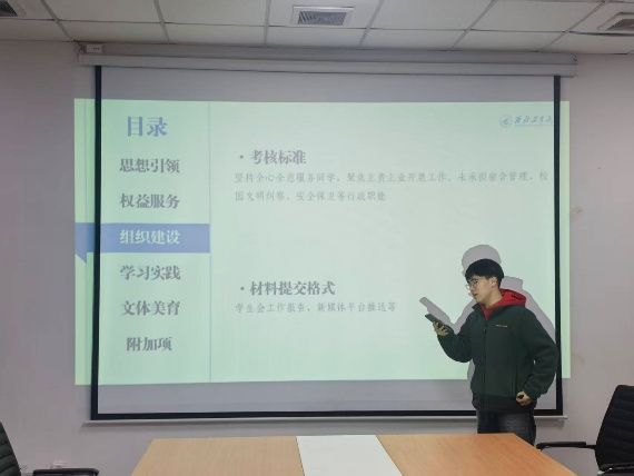 会议伊始,学生会主席团成员唐子皓围绕思想引领、权益服务、组织建设、学习实践、文体活动五大方面,汇报了本年度学生会的工作成果。随后,各部门负责人依次梳理本学年工作,从部门职责、工作开展、不足及未来规划四方面总结,明确问题与应对方案。